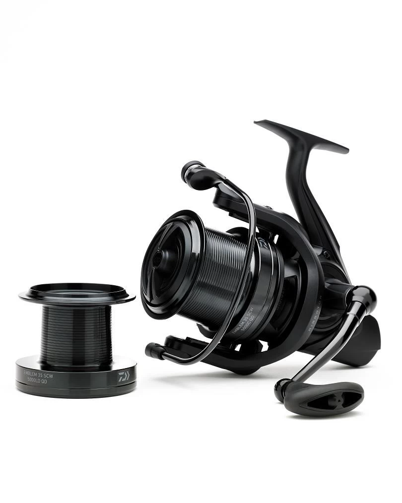 This latest addition to Daiwa’s ever popular Emblem reel series offers you a high performance big pit style reel designed for casting baits to maximum distance from the bank, or rowing them out and dropping them even further. With a 35mm spool configuration, the most popular big pit choice. This edition is supplied with a shallow C and spare deep LD spool; (300m – 0.35mm and 530m – 0.35mm). In addition they carry features like Daiwa’s reduced oscillation speed Slow Cross Wrap system, enhancing the line lay. Retrieval conversion is high at 106cm per handle turn and thanks to the Air Rotor and 6 ball bearings, winding remains smooth under loading. The QD Quick Drag comes as standard, so setting up for that run and engaging the take remains simple.