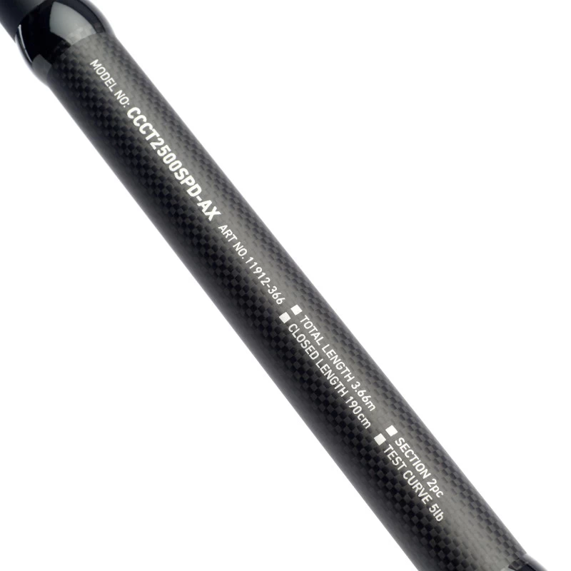 - CCCT2500SPD-AX – Length 12ft – Weight 390g – T/Curve 5.00lb – C/Weight 12oz – Rec Reel Line 10-20lb – Closed Length 205cm