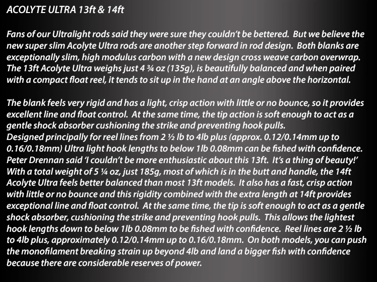 The Drennan Acolyte Ultra 14ft Float rod, featuring a high quality high modulus carbon blank has been designed for reel lines of 2.5lb to 4lb plus, roughly 0.12/0.14mm up to 0.16/0.18mm diameter monofilament. With a total weight of just 5.25oz, the vast majority of which is in the butt and handle, the rod is actually better balanced than most 13ft models. The blank feels very rigid and has a light crisp action with little or no bounce, so it provides really excellent line and float control. At the same time, the tip action is soft enough to act as a gentle shock absorber, cushioning the strike and preventing hook pulls. This allows for lighter hook lengths, to below 1lb 0.08mm to be fished with confidence.