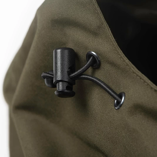 - Fully adjustable peaked three panel hood with adjustable bungee cords