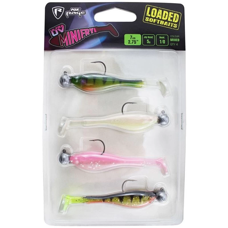 Fox Rage Mini Fry Loaded Ultra UV, a grab and go pack of 7cm soft plastic lures in a mix of colours. Mounted on a matching jighead, and ready to use straight out the pack. With four different colours included, each featuring the Fox Rage unique Ultra-Violet coating for increased fish attraction.