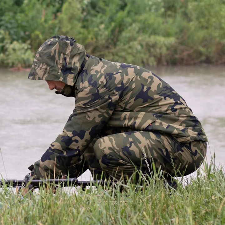 Manufactured with a uniform camouflage pattern throughout. This specialised jacket and trouser combo ensures that you are ready for whatever the weather throws at you. These come supplied in a transportable carry bag and has two water-repellent zipped pockets for extra safe storage.
