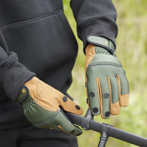 Neoprene stretch gloves give a tight comfortable fit, with the added benefits of a super grippy rubberised coating on the fingers and palm. Plus the additional benefit of the thumb, index and middle finger tips folding back allowing you to tie knots build rigs and tap messages on your phone a lot easier without having to remove the glove and loosing the heat!