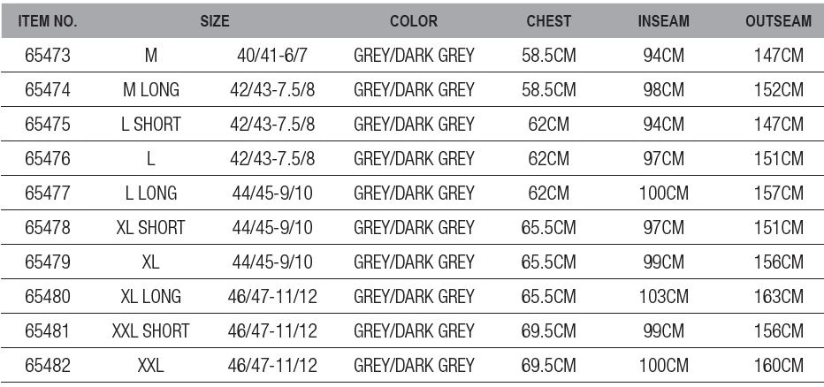 - XX-Large – Waist size 46/47 Inch – Shoe size 11/12 – Chest 69.5cm – Inseam 100cm – Outseam 160cm