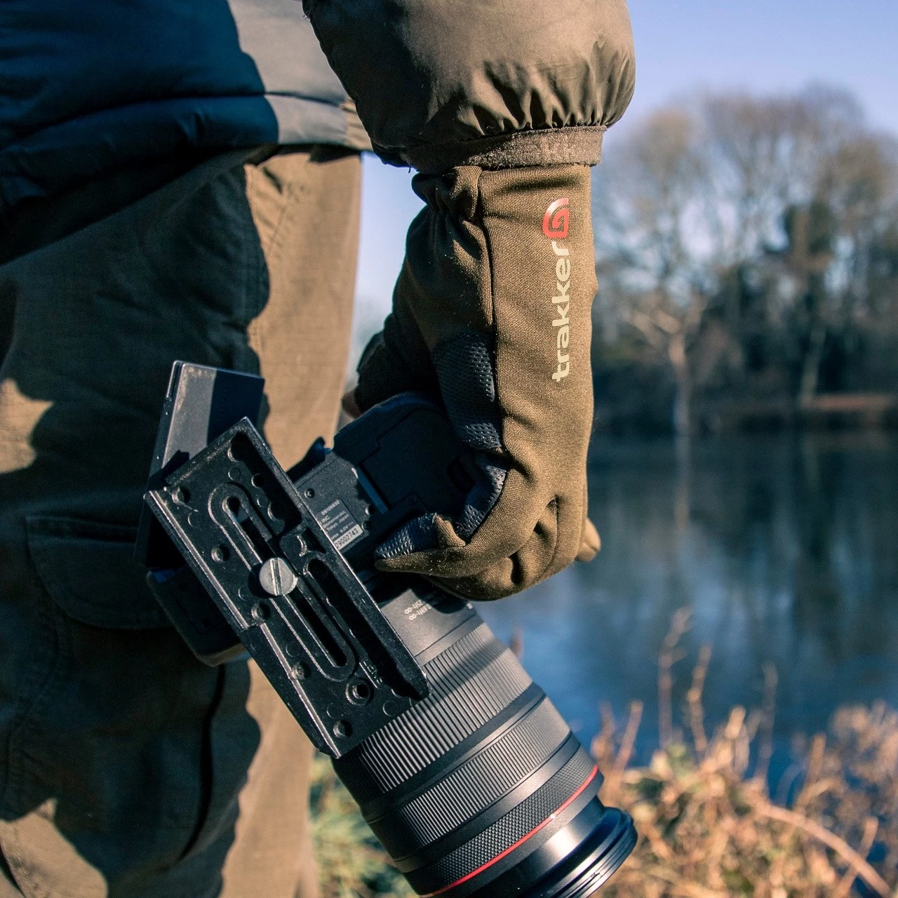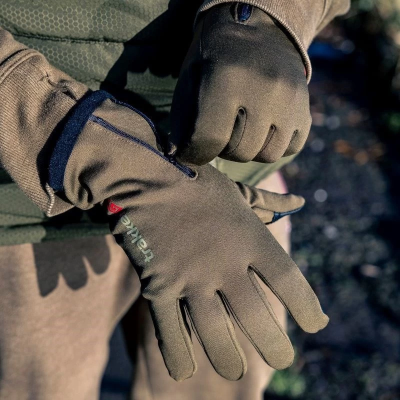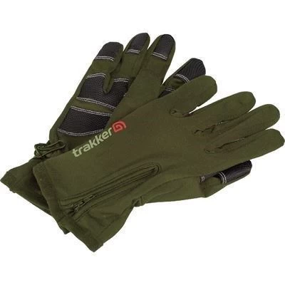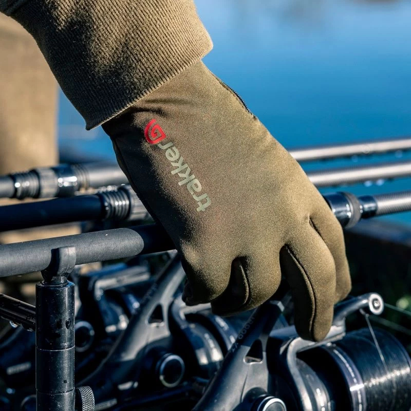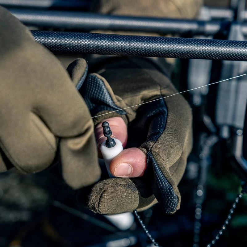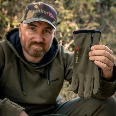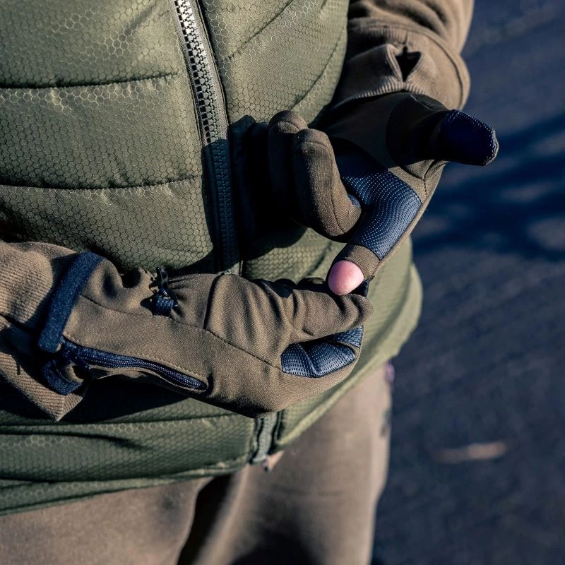 Water resistant thermally insulated gloves that zip on for a closer fit. With patches on the fingers and palm for improved grip. The thumb and index finger fold back to make rig tying and mounting baits easier.